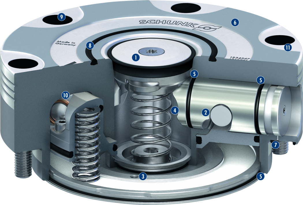 夾持過(guò)程由集成的彈簧組件執(zhí)行。動(dòng)力傳遞通過(guò)專(zhuān)利驅(qū)動(dòng)機(jī)構(gòu)實(shí)現(xiàn),它將有效的彈簧力轉(zhuǎn)換為定位銷(xiāo)的最大下拉力。夾持自動(dòng)鎖定,下拉力可在集成渦輪增壓功能的幫助下增加??墒褂? bar系統(tǒng)壓力打開(kāi)。
